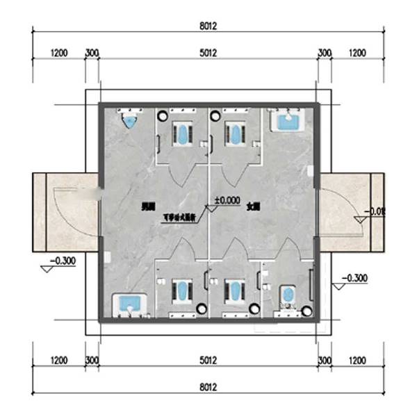 Designed for men's restroom and women's restroom, this 8CS flat roof prefab public toilet covers an area of 29.45 square meters, including a canopy of 4.32 square meters. Our prefab toilet featuring white wall flat roof, glass canopy and wooden fence provides a favourable environment for users while sheltering them from the sun and rain.