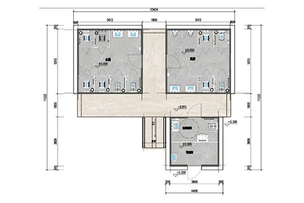 Divided into men's restroom , women's restroom, unisex restroom and utility room, this 19CS flat roof prefabricated public toilet covers an area of 95.06 square meters, including a canopy of 30.3 square meters. The white wall together with the flat roof, glass canopy and wooden fence in our prefab toilet provides a favourable environment for users while sheltering them from the sun and rain.